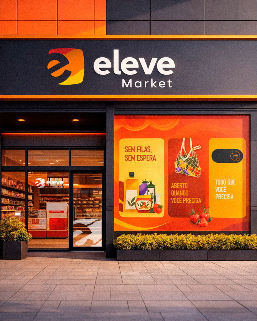 Conheça Eleve Market: um mercado autônomo 24 horas criado para atender a qualquer hora, sem fila e sem complicação. Uma solução de conveniência direta, que precisava de uma identidade igualmente direta.