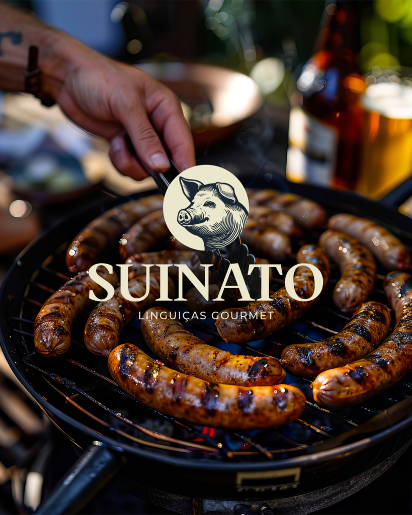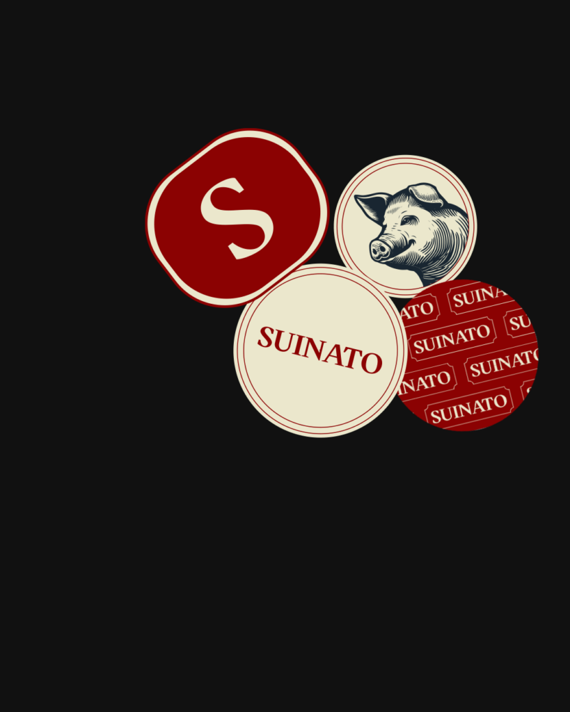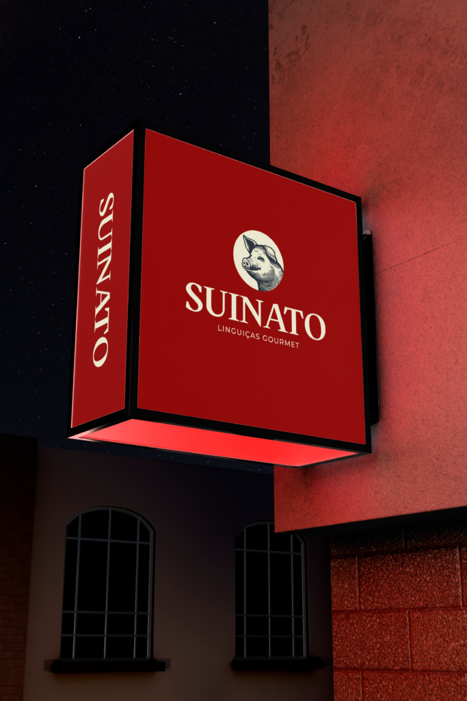 O porco na logo carrega a história de um animal que é símbolo de fartura na cultura brasileira. O vermelho carmesim traz calor e apetite, o preto dá peso e seriedade, e a Wittgenstein Bold fecha esse conjunto com uma tipografia que tem presença física em qualquer superfície.