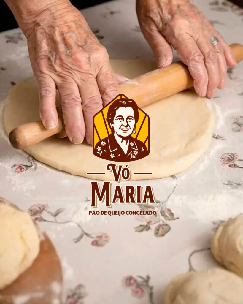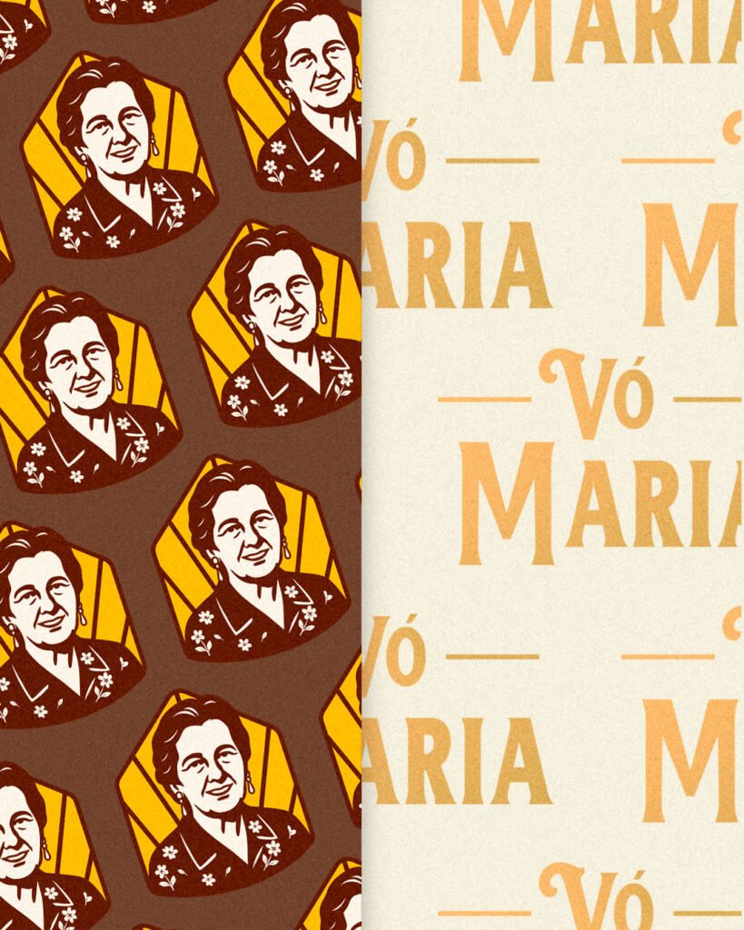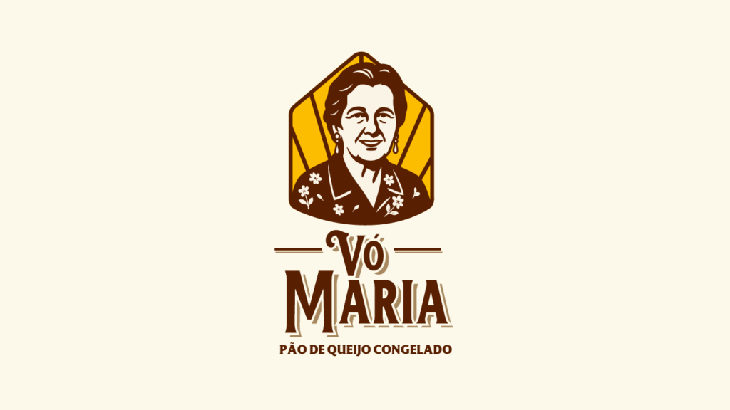 O rosto da Vó Maria virou o centro de tudo. A ilustração carrega personalidade e calor, com linhas limpas e uma paleta que vai do marrom queimado ao dourado generoso. Cores que remetem ao pão saindo do forno, ao cheiro que toma conta da cozinha, à memória afetiva que o produto desperta em quem cresce comendo pão de queijo em Goiás.